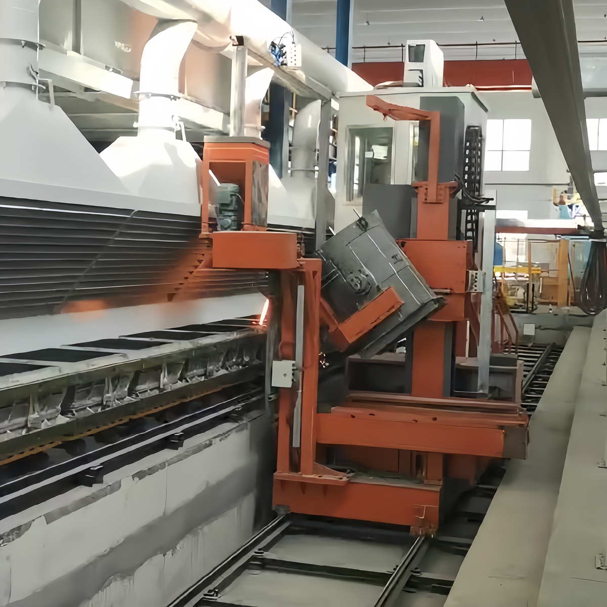 ABM一直在给自己造型线配套自动浇注机,已经有十几年的历史。有手动浇注机、半自动浇注机和全自动浇注机。手动浇注机是由人工控制行走和浇注。半自动浇注机一半行走和找浇口杯是自动,浇注是手动。全自动浇注机则行走、找浇口杯和浇注均是自动,自动控制浇注方式有教学式浇注,视频控制浇注和重量控制浇注。
