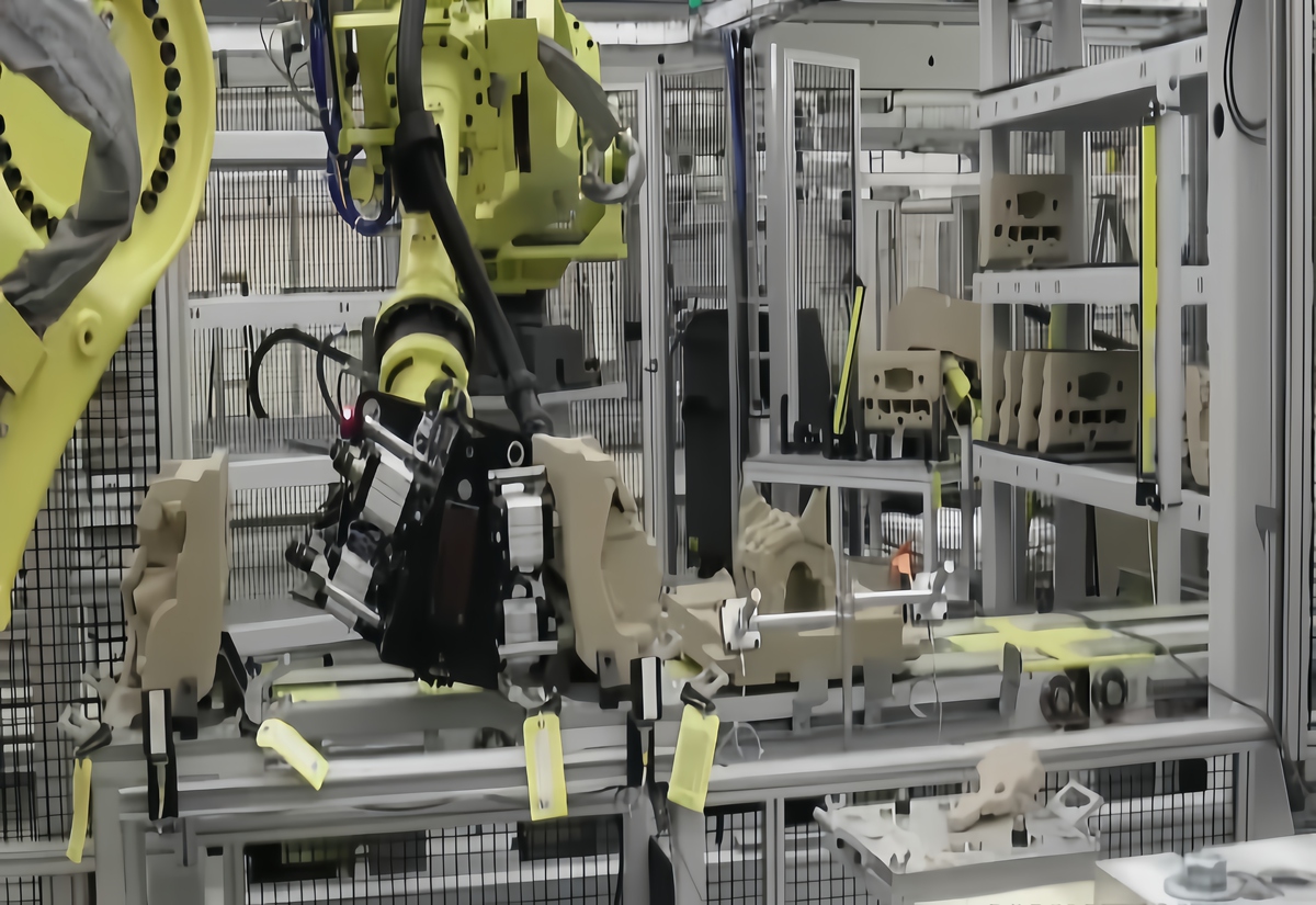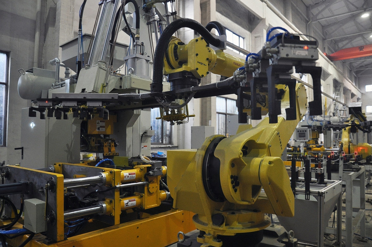 制芯中心是指将制芯机、机器人和其它设备组合在一起,完成自动制芯、取芯、上涂料、烘干和运输等工作的整个系统。小的制芯中心仅仅完成自动制芯、取芯和输送到指定位置的功能,如刹车盘之类的简单泥芯。大的制芯中心可以由几个小的制芯中心组成,并需要完成上涂料、烘干和自动将不同泥芯装配在一起的组芯工作,需要大量机器人配合完成。